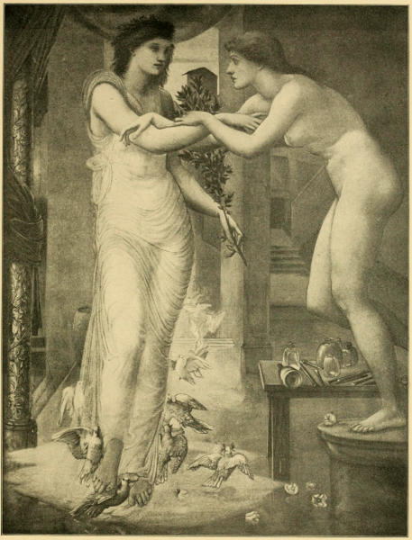 "The four pictures from 'The Story of Pygmalion,'" he writes, "also included in The Earthly Paradise, again show this preference of the poet and the artist for the spirit before the form, provided only the last be beautiful. The first, 'The Heart Desires,' is the idealization of unsatisfied longing for the unknown. Pygmalion, a tall, dark-haired young man, in a long garment falling in straight folds to his feet, stands brooding on life's emptiness in the vestibule of his house. A sculptured group of the Three Graces denotes his profession and at the same time typifies the cold beauty of artifice, the beauty of the mind, while two girls, seen through the open door, speeding along the street in the artless embrace of innocent maidenhood, represent the beauty of the body and the love that waits his winning; but in neither finds he consolation. In the second, 'The Hand Refrains,' the days of long labor are ended, and the artist's ideal, the cold, pure figure of the yet soulless image stands finished on the still rough pedestal, surrounded by flakes and chips of marble and implements of the sculptor's craft, while Pygmalion, chisel and mallet in hand, stays gazing in awe at the marvel his hand has achieved, his eyes content, but his soul still hungering. Outside the window behind him women go about their daily business in the city street, and through another casement, in a recess between him and the image, is a glimpse of a garden and a spurt of water falling into a marble basin—the constant dropping that wears away the stone, as his constant prayers shall move the goddess Venus to a miracle on his behalf. The third bears the motto, 'The Godhead Fires.' Into the sculptor's chamber, silent and solitary, while Pygmalion is away in the temple, floats lightly the Queen of Love, clad in a soft, transparent robe, flower-crowned and bearing a branch of myrtle, emblem of marriage rites, her feet brushed and environed by the white wings of her favorite doves. Towards her, leaning both arms on one uplifted from the goddess's side, an exquisite piece of composition, the awakening image stoops from the carved capital, blossom-strewn by the adoring Pygmalion, her eyes raised in awe up to the goddess, who with fixed gaze and pointed finger inspires her with the Promethean fire of life. Lastly, 'The Soul Attains.' Heart and soul are alike satisfied. Pygmalion kneels, looking up in trembling worship at the beautiful creature who lingeringly yields him her hands, though she still gazes out beyond him in dumb amazement at the mystery of consciousness that has suddenly been born in her. Marble no longer, but not yet altogether woman."