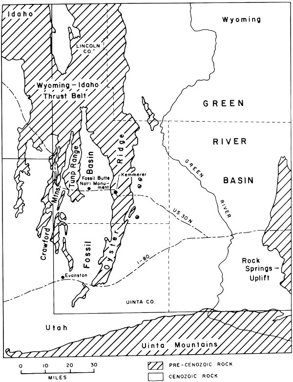 Fossil Butte National Monument is near the geographical center of Fossil Basin. The basin itself is located in the extreme southwestern part of Wyoming in Uinta and Lincoln counties, near the Utah-Idaho border (Fig. 2).
