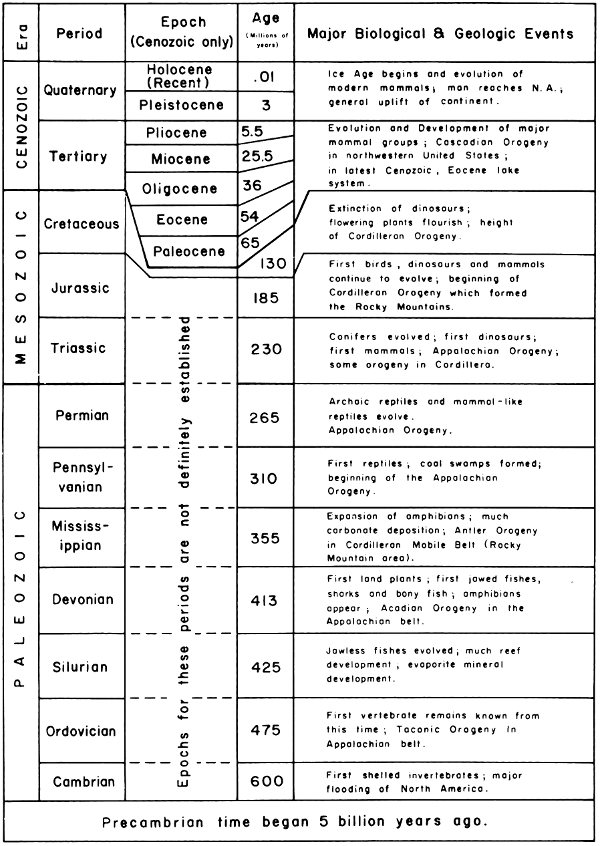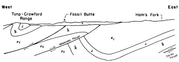 At the base of the stratigraphic section are rocks of Precambrian age. These have not been penetrated by wells within the Fossil Basin but should occur as much as 25,000 ft beneath the surface. They probably consist of metamorphic and intrusive rocks. Beginning about 600 million years ago, at the beginning of Cambrian time, sedimentary deposits accumulated. These are both marine and continental in origin and range in age from early Cambrian (600 million years old) to early Tertiary (50 million years old). Some 34 geologic formations are recognized in this thick section, a list of which follows: