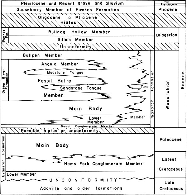 The latest subdivision of the Wasatch Formation in the Fossil Basin is that of Oriel and Tracey. The members of the Wasatch Formation they propose are described in order from oldest to youngest.