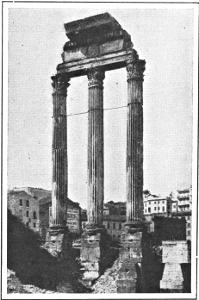 Of the other buildings connected with the Forum the most conspicuous is the temple of Castor and Pollux, just beyond the Basilica Julia. The ruins consist of three slender columns, standing on a high foundation and supporting a fragment of the entablature. These remains belong to the reconstruction of the temple under Augustus. The worship of the twin gods, Castor and Pollux, patrons of cavalry, had been introduced from Greece into Rome in the early republic. The front porch of the temple often served as a platform for party leaders while addressing the crowd in the Forum. On such occasions it sometimes became the center of violent political conflicts out of keeping with the beauty of the surroundings. This temple and nearly all others at Rome are of the Corinthian order of architecture, distinguished by the capital of clustered acanthus leaves surmounting the graceful fluted column. It is one of the best of its class; and the three columns with their entablature form the most beautiful architectural fragment still preserved from classical Rome.