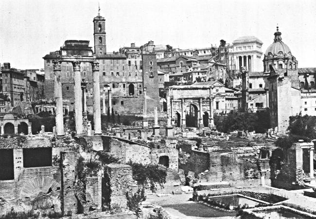 The present level of the Forum is many feet lower than that of its immediate surroundings. During the three thousand years that separate us from the beginnings of the city the valleys have been gradually filling through the accumulation of debris of ruined buildings, the washings of earth from the surrounding hills, and various other means. Recently scholars have excavated nearly the whole Forum down to the earliest level, laying bare the lower parts of buildings, the earlier pavements, altars, a primeval cemetery, and many other objects. Nearly everything found has been identified and clothed in the historical imagination with the associations of the time when it had a purpose and a meaning. But the spot, once the abode of intense life, is now still; it seems the burial place of a dead society and government; state officials keep drowsy guard over the remains. Tourist and scholar walk undisturbed through this sepulcher of a mighty empire, their senses awakened to the ancient life only by the rush of waters through the subterranean Cloaca Maxima, and to the life of our day by the roses, geraniums, and wild Italian flowers that grow luxuriantly wherever a bit of soil is left.