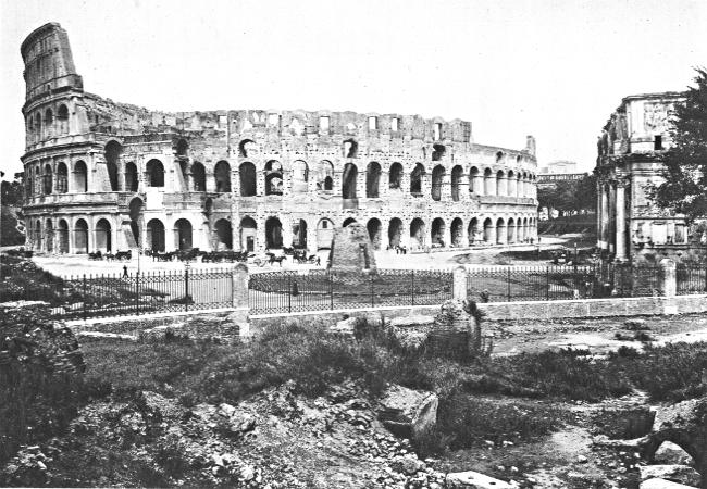 Some of the most imposing palaces which lend dignity to the modern city have been built with this material. Although fully half the stone has been thus removed, the part of the structure which still remains is the most impressive of all the ruins of the city—a monument of the grandeur and of the moral degradation of Rome. It is an especially rich experience to visit the Colosseum by moonlight, where, seated on a stone at the edge of the arena, we may in imagination, with the aid of the tranquil light, reconstruct the vast interior and repeople it with a Roman multitude breathlessly awaiting the opening of the games or exulting over the triumph of a popular favorite. On certain nights the municipal authorities illuminate the interior with colored lights, whose weird spell awakens the imagination to sights of bloody conflict amid a yelling, savage mob.