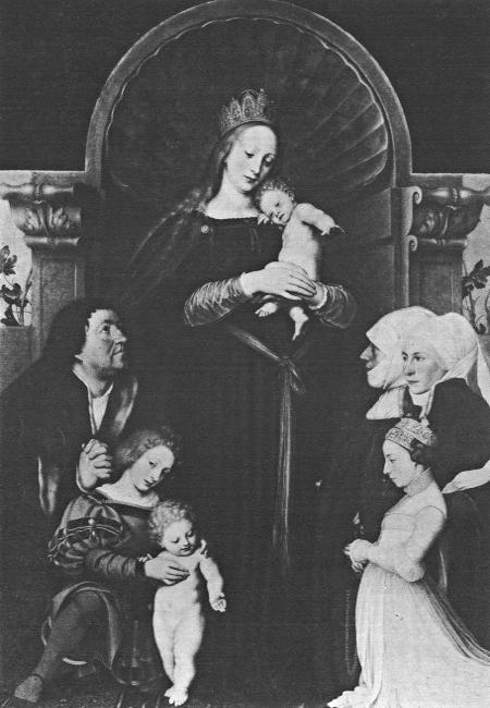 Finely composed again is the famous Madonna of the Meier family. The kneeling figures make the base of a pyramid, the lines of which are carried up by the Madonna’s cloak and the Christ Child’s outstretched hand. Perhaps the formal arrangement and the stately niche are a little out of keeping with the evident simplicity of all the people. In fact, the greatness of the picture lies mainly in its vitality, in the sense of strength and devotion it conveys. Holbein, like Dürer, conceives the Virgin simply as a German mother, none too intelligent, and rather ungraceful, but wholly wrapped up in the Divine Child, who is after all much like an ordinary German baby. The gentleness of Mary’s clasped hands is one of the many beautifully studied details.