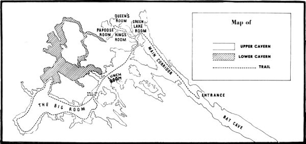 For three days, the strangely-matched pair roved and explored the recesses of the cave, covering about the same territory now open to visitors who take the guided tours. For Jim White and the Kid, however, there was not the comfortable element of bright lights—certainty—and sure-footed guides along well-established paths. Their three-day exploration was an unbroken chain of hazards and thrills, findings and fears, adventures which sound exaggerated even when evidence lends them support!