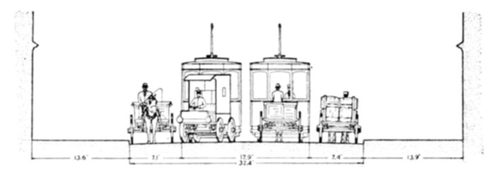 [39] In estimating the gross tonnage, the following average weights were used: a street car with average load—19 tons; a heavy wagon (including team), averaging loaded and empty vehicles—4 tons; a light wagon (including team), averaging loaded and empty vehicles—1.75 tons; an automobile or carriage (including team),—.9 tons; pedestrians and passengers are figured at 150 pounds apiece.