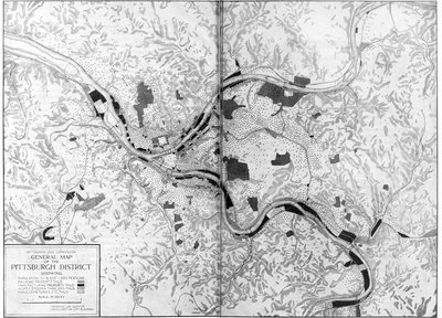 As explained at length in the body of the report, the work has been greatly handicapped and limited in its scope and effectiveness by the entire lack of accurate detailed maps of the city and surrounding country. This lack would have rendered the report almost wholly impossible had it not been for the very useful topographical map of this part of Pennsylvania prepared and published by the United States Geological Survey. Not only have my studies of the outlying thoroughfares been based almost wholly upon this map, but the Survey has courteously permitted the use of transfer sheets from their original plates for the thoroughfare map published in this report.