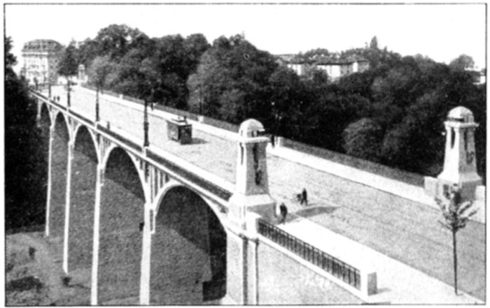 The other railroad bridge crossing the river within the city limits is the Thirty-third Street viaduct of the Baltimore and Ohio Railroad. This is a link in the Baltimore and Ohio Railroad between the East and the West and carries an enormous traffic amounting each year to about 217,000 passengers and 24,330,000 tons of freight, express and other trains.