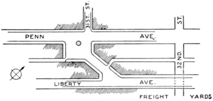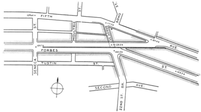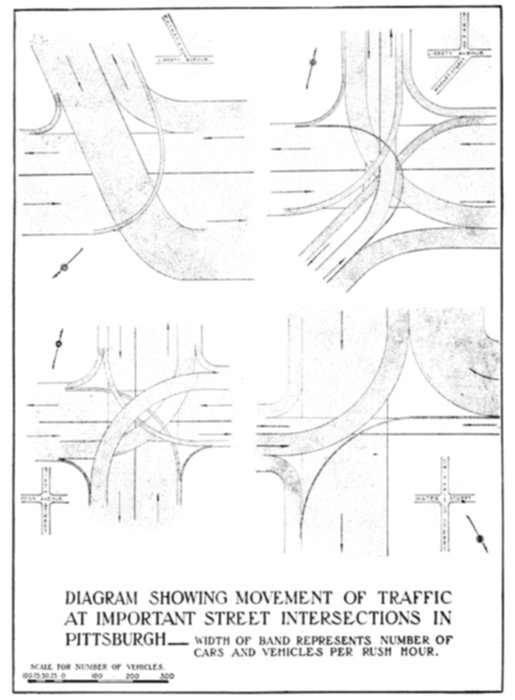 A factor in the cost of living in Pittsburgh is stated graphically in the frontispiece of this report. These drawings also suggest, from Pittsburgh's own provision for some of her needs, a method to decrease this cost. All delays and congestion of traffic, such as illustrated on Fifth Avenue and East Ohio Street in the frontispiece and as shown by illustrations in this preface and the introduction, add to the expenses of manufacturers, the costs borne by wholesale merchants, and the prices charged consumers by retail dealers; in short inadequate traffic facilities in Pittsburgh, as in other cities, add to the cost of doing business and of living.