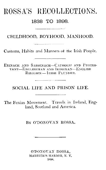 Dear Rossa—I read with delight in the last issue of your truly patriotic journal what to me is the most interesting of all stories; namely, “Rossa’s Recollections.”