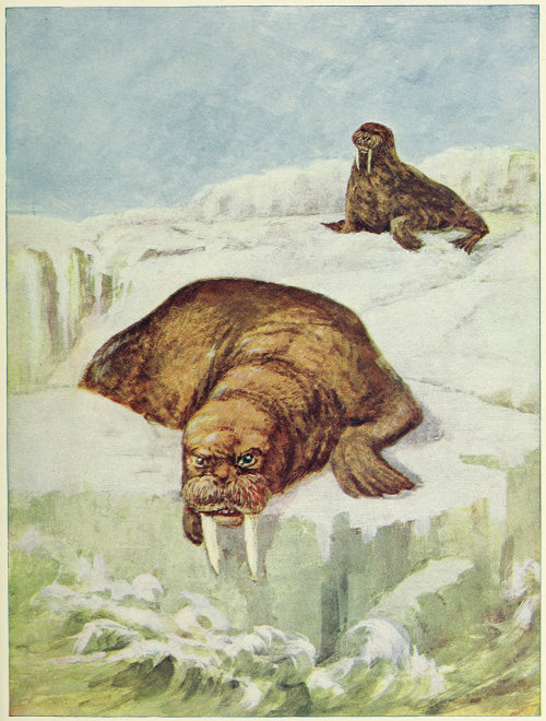 One of the favorite amusements of the Walrus is to float in the water with his hind flippers hung down and his nose comfortably above the wash and either fall asleep or indulge in deep roarings which are said to sound like something between the mooing of a cow and the baying of a mastiff and which often serve, like whistling buoys, to warn sailors from rocks and shoals.