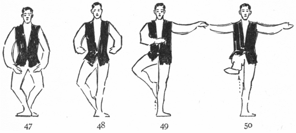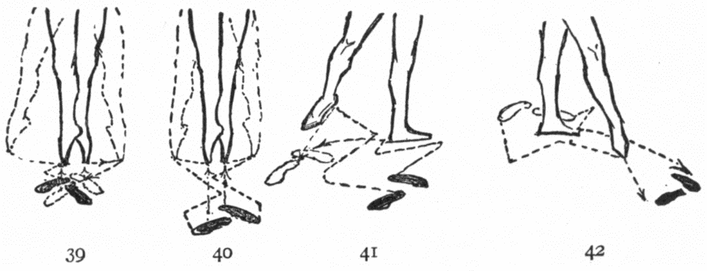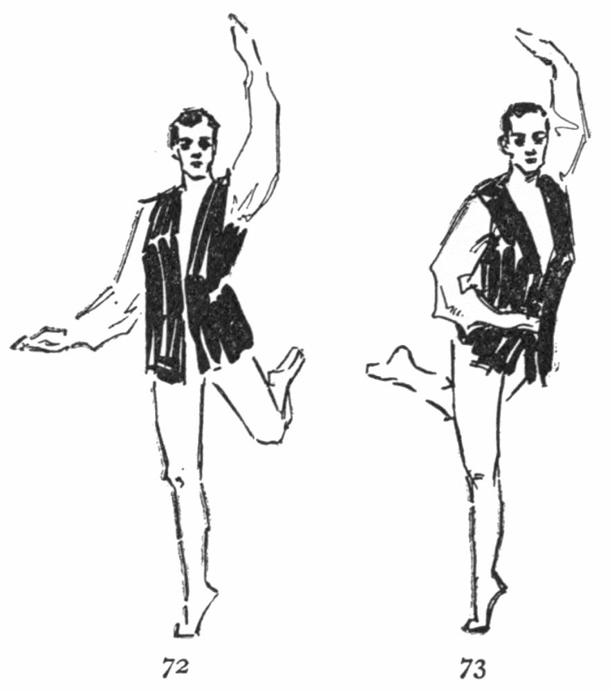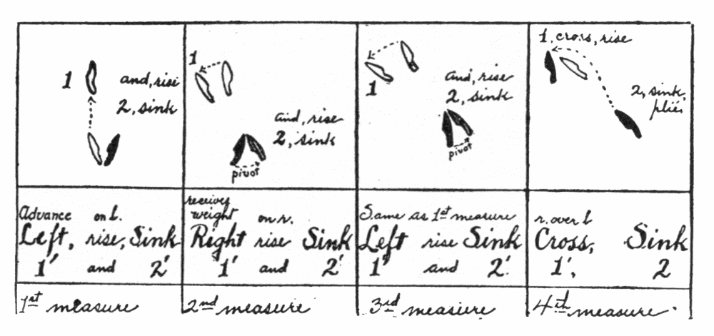 Dawn of stars. Sallé. Prévost. Camargo. New standards. Expression. New steps added to those derived from old dances: Gavotte, Minuet, Pavane, Saraband, Tordion, Bourrée, Passecaille, Passepied, Chaconne, Volte, Allemande, Gaillarde, and Courante. Their formality; illustrations. | ||