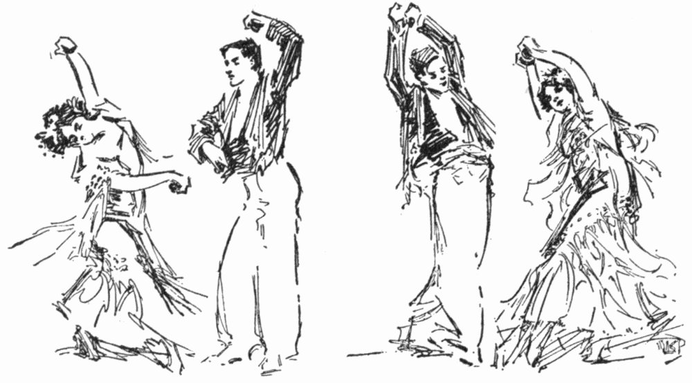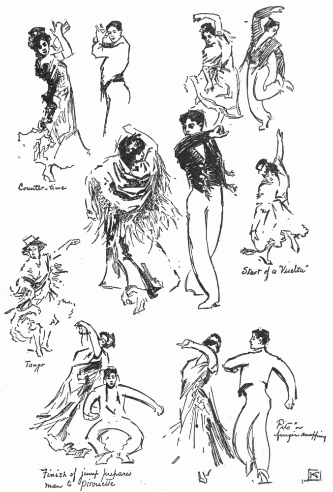 Two schools, Flamenco (Gipsy origin) and Classic. The Gipsy. La Farruca, el Tango, el Garrotin; distinct character. Costume. Classic: Seguidillas family. Las Sevillanas; general character. The Fandango rarely seen. La Malagueña y el Torero. Las Malagueñas. The Bolero. Castanets. Los Panaderos. The Jota of Aragon, character, costume, etc. Other dances. | ||