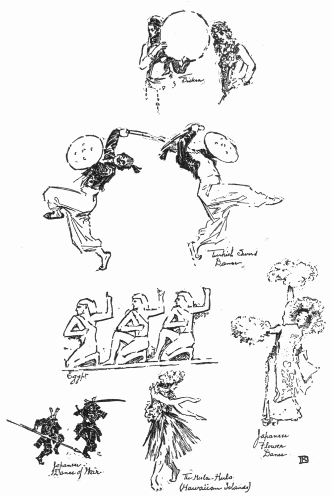 Symbolism, decoration, pantomime, story in the dance. Sensational mismanagement in Occidental countries. Mimetic dancing a substitute for newspapers. The Dance of Greeting; welcome, blessings, etc. Structure of Arabic choreography. Handkerchief Dance of Cafés; candour. Flour Dance. Popular narrative dances. Fantasia of Bedoui; religious outbreaks. Dancing for tourists; the Almées. Dance, Awakening of the Soul. Animate sculpture. Oriental technique. Sword Dance of Turkey. Dervishes. Lezginkà of the Caucasus. Ruth St. Denis; Nautch; Spirit of Incense; the Temple; the Five Senses. Antiquity; carvings in India and Java. Hula-Hula of Hawaii. Priestesses trained for religious dancing. Japan: dancing for all occasions. Abstractness of symbols. Dances of war. | ||