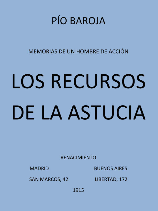 The Project Gutenberg EBook of Memorias de un Hombre de Acción: #5 Los Recursos de la Astucia, by Pío Baroja This eBook is for the use of anyone anywhere in the United States and most other parts of the world at no cost and with almost no restrictions whatsoever. You may copy it, give it away or re-use it under the terms of the Project Gutenberg License included with this eBook or online at www.gutenberg.org. If you are not located in the United States, you'll have to check the laws of the country where you are located before using this ebook. Title: Memorias de un Hombre de Acción: #5 Los Recursos de la Astucia Author: Pío Baroja Release Date: October 4, 2015 [EBook #50126] Language: Spanish Character set encoding: ISO-8859-1 *** START OF THIS PROJECT GUTENBERG EBOOK MEMORIAS DE UN HOMBRE *** Produced by Carlos Colón, University of Toronto and the Online Distributed Proofreading Team at http://www.pgdp.net (This file was produced from images generously made available by The Internet Archive)