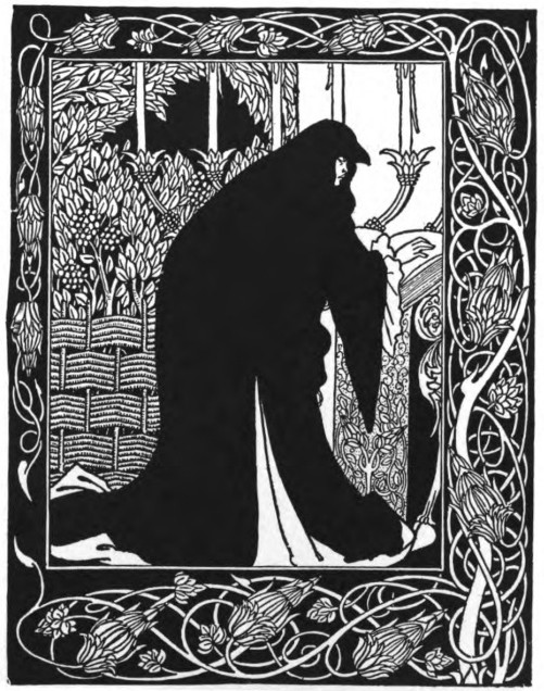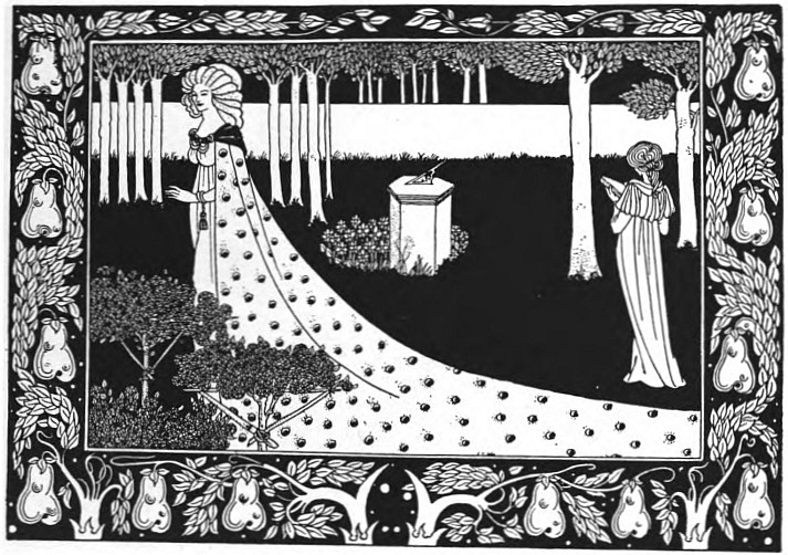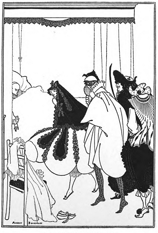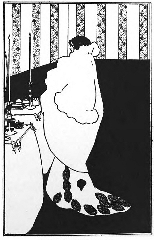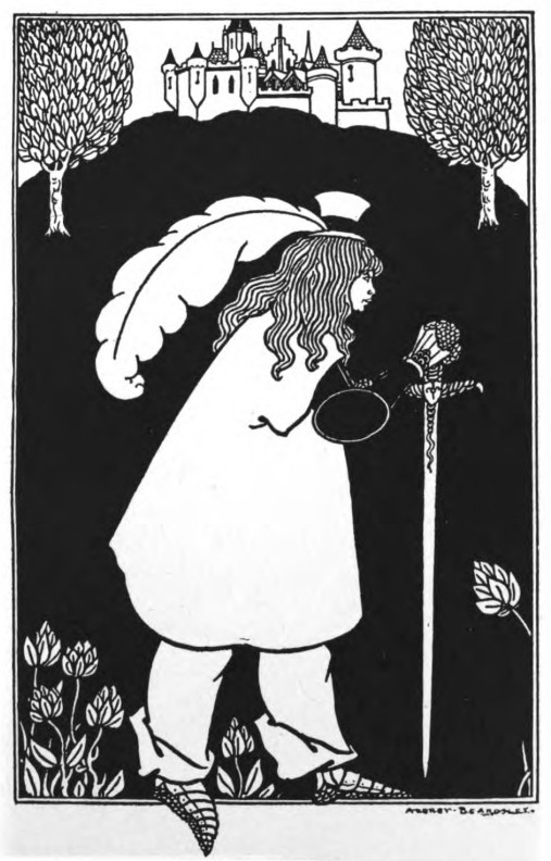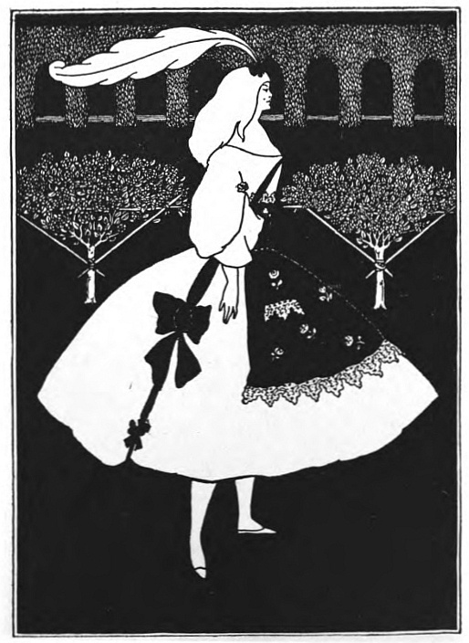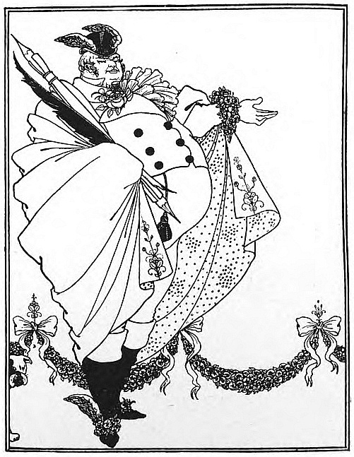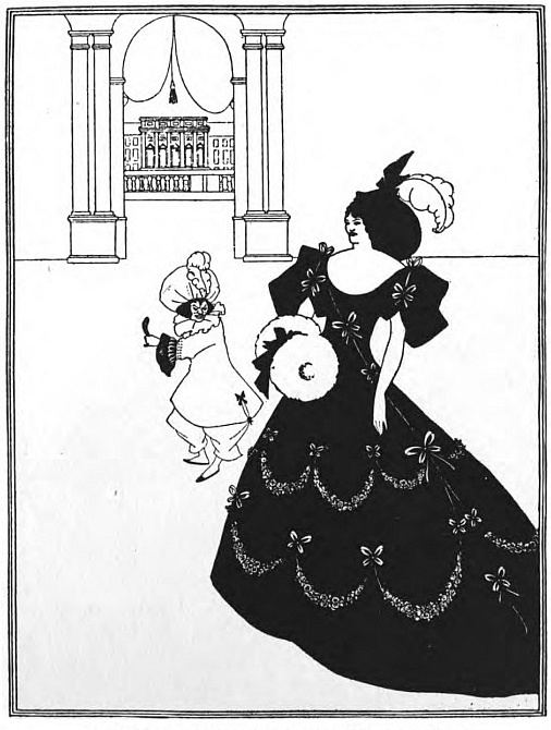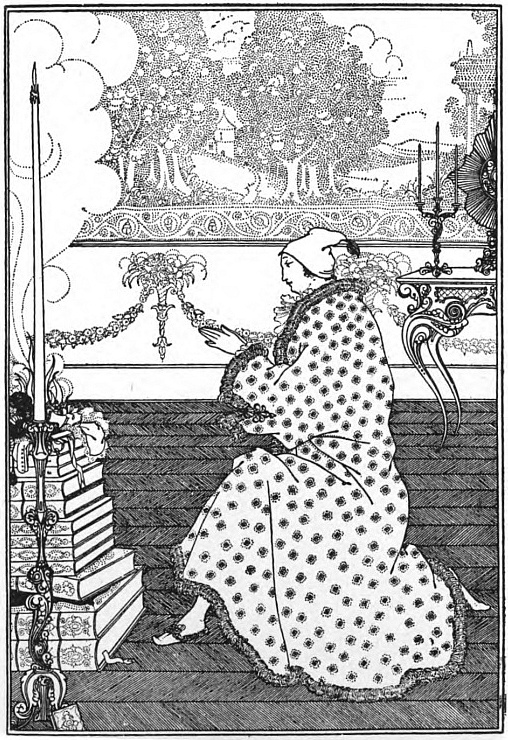 And Beardsley, with almost more than the Parisian's deference to Paris, and to the moment, was, more than any Parisian, this Pierrot gamin. He was more than that, but he was that: to be that was part of what he learnt from France. It helped him to the pose which helped him to reveal himself: as Burne-Jones had helped him when he did the illustrations to the "Morte d'Arthur," (Ill. 7-10) as Japanese art helped him to free himself from that influence, as Eisen and Saint-Aubin showed him the way to the "Rape of the Lock." (Ill. 53) He had that originality which surrenders to every influence, yet surrenders to absorb, not to be absorbed; that originality which, constantly shifting, is true always to its centre. Whether he learnt from M. Grasset or from Mr. Ricketts, from an 1830 fashion-plate, or from an engraved plate by Hogarth, whether the scenery of Arques-la-Bataille composed itself into a pattern in his mind, or, in the Casino at Dieppe, he made a note of the design of a looped-up window-blind, he was always drawing to himself, out of the order of art or the confusion of natural things, the thing he wanted, the thing he could make his own. And he found, in the French art of the moment, a joyous sadness, the service to God of Mephistopheles, which his own temperament and circumstances were waiting to suggest to him—.