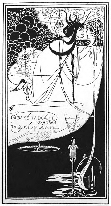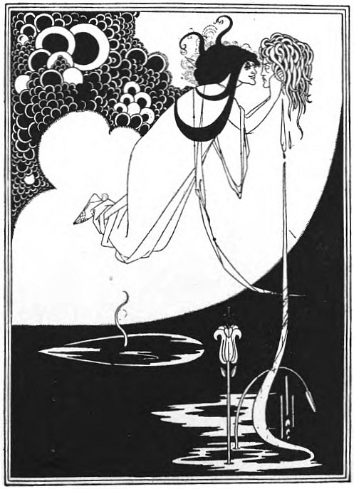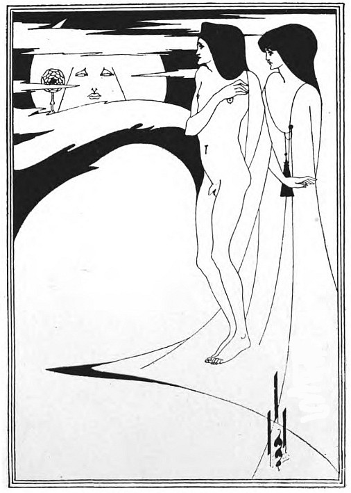 At times he attains pure beauty, has the unimpaired vision; in the best of the "Salomé" (Ills. 15-29) designs here and there afterwards. From the first it is a diabolic beauty, but it is not yet divided against itself. The consciousness of sin is always there, but it is sin first transfigured by beauty, and then disclosed by beauty; sin, conscious of itself, of its inability to escape itself, and showing in its ugliness the law it has broken. His world is a world of phantoms, in which the desire of the perfecting of mortal sensations, a desire of infinity, has over-passed mortal limits, and poised them, so faint, so quivering, so passionate for flight, in a hopeless and strenuous immobility. They have the sensitiveness of the spirit, and that bodily sensitiveness which wastes their veins and imprisons them in the attitude of their luxurious meditation. They are too thoughtful to be ever really simple, or really absorbed by either flesh or spirit. They have nothing of what is "healthy" or merely "animal" in their downward course towards repentance; no overwhelming passion hurries them beyond themselves; they do not capitulate to an open assault of the enemy of souls. It is the soul in them that sins, sorrowfully, without reluctance, inevitably. Their bodies are faint and eager with wantonness; they desire more pleasure than there is in the world, fiercer and more exquisite pains, a more intolerable suspense. They have put off the common burdens of humanity, and put on that loneliness which is the rest of saints and the unrest of those who have sinned with the intellect. They are a little lower than the angels, and they walk between these and the fallen angels, without part or lot in the world.