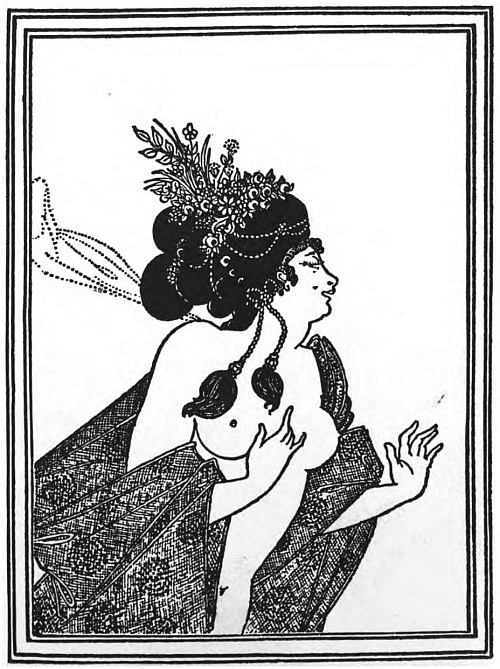 In the "Salomé" (Ills. 15-29) drawings, in most of the "Yellow Book" (Ills. 33, 34, 35, 37, 40, 41) drawings, we see Beardsley under this mainly Japanese influence; with, now and later, in his less serious work the but half-admitted influence of what was most actual, perhaps most temporary, in the French art of the day. Pierrot gamin, in "Salomé" itself, alternates, in such irreverences as the design of "The Black Cape," (Ill. 17) with the creator of the noble line, in the austere and terrible design of "The Climax," (Ill. 24) the ornate and vehement design of "The Peacock Skirt." (Ill. 16.) Here we get pure outline, as in the frontispiece; a mysterious intricacy, as in the border of the title-page and of the table of contents; a paradoxical beauty of mere wilfulness, but a wilfulness which has its meaning, its excuse, its pictorial justification, as in "The Toilette." (Ill. 22). The "Yellow Book" and the first drawings for the "Savoy," (Ills. 54-57) a new influence has come into the work, the influence of the French eighteenth century. This influence, artificial as it is, draws him nearer, though somewhat unquietly nearer, to nature. Drawings like "The Fruit Bearers," in the first number of the "Savoy," with its solid and elaborate richness of ornament, or "The Coiffing," in the third number, with its delicate and elaborate grace, its witty concentration of line; drawings like the illustrations to the "Rape of the Lock," (Ill. 53) have, with less extravagance, and also a less strenuous intellectual effort, a new mastery of elegant form, not too far removed from nature while still subordinated to the effect of decoration, to the instinct of line. In the illustrations to Ernest Dowson's "Pierrot of the Minute," (Ills. 45-47) we have a more deliberate surrender, for the moment, to Eisen and Saint-Aubin, as yet another manner is seen working itself out. The illustrations to "Mademoiselle de Maupin," seemed to me, when I first saw them, with the exception of one extremely beautiful design in colour, to show a certain falling off in power, an actual weakness in the handling of the pen. But, in their not quite successful feeling after natural form, they did but represent, as I afterwards found, the moment of transition to what must now remain for us, and may well remain, Beardsley's latest manner. The four initial letters to "Volpone," the last of which was finished not more than three weeks before his death, have a new quality both of hand and of mind. They are done in pencil, and they lose, as such drawings are bound to lose, very greatly in the reduced reproduction. But, in the original, they are certainly, in sheer technical skill, equal to anything he had ever done, and they bring at the last, and with complete success, nature itself into the pattern. And here, under some solemn influence, the broken line of beauty has reunited; "the care is over," and the trouble has gone out of this no less fantastic world, in which Pan still smiles from his terminal column among the trees, but without the old malice. Human and animal form reassert themselves, with a new dignity, under this new respect for their capabilities. Beardsley has accepted the convention of nature itself, turning it to his own uses, extracting from it his own symbols, but no longer rejecting it for a convention entirely of his own making. And thus in his last work, done under the very shadow of death, we find new possibilities for an art, conceived as pure line, conducted through mere pattern, which, after many hesitations, has resolved finally upon the great compromise, that compromise which the greatest artists have made, between the mind's outline and the outline of visible things.