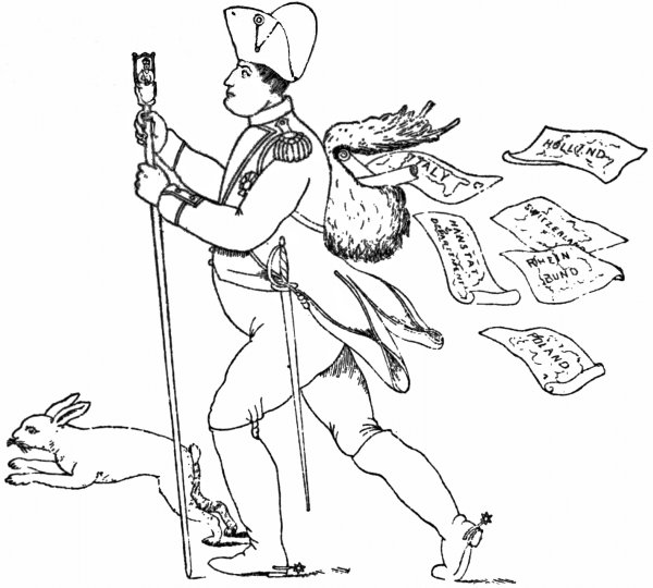 A Captain Wright figures in this plot; and, as he was an Englishman, and his name is frequent both in the caricature and satire of the day, some notice of him must be given. He was a lieutenant in the Royal Navy, and somehow got mixed up with this conspiracy. He took Georges Cadoudal and others on board either at Deal or Hastings, and crossed over to Beville, where there was a smuggler’s rope let down from an otherwise inaccessible cliff. By means of this they were drawn up, and went secretly to Paris. The plot failed, and they were thrown into prison, Wright being afterwards captured at sea. Cadoudal went to the scaffold, Pichegru was found strangled in his cell; and Wright, the English said, after being tortured in prison, to compel him to give evidence against his companions, was assassinated by order of Napoleon.