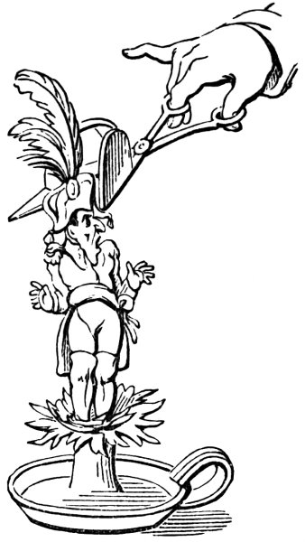 Dean Swift’s immortal book did yeoman’s service to the caricaturists, and we find it again employed in a print by West, December 1803: ‘The Brobdingnag Watchman preventing Gulliver’s landing.’ It is very feeble, and merely consists of George the Third as a watchman turning the light of the ‘Constitutional Lanthorn’ upon Bonaparte and his companions, who are attempting a landing.
