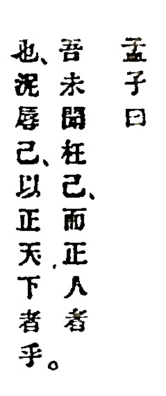 (Mencius dit: «Je n'ai jamais entendu dire que quelqu'un eût réformé l'Empire en se déformant soi-même; encore moins, qu'il eût réformé l'Empire en se déshonorant soi-même.») |