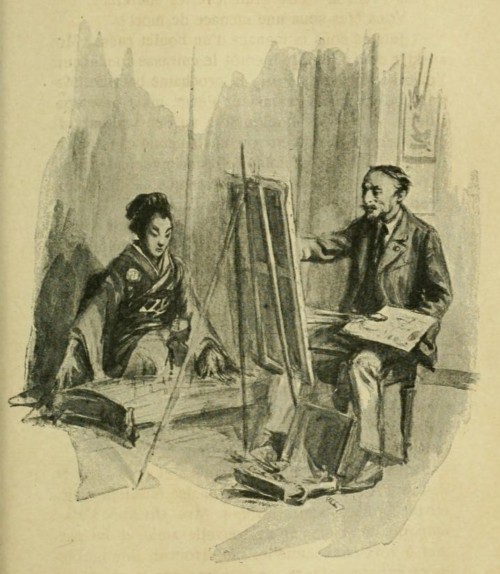 —Oui... Oh! je ne prévoyais naturellement pas alors que je vous verrais un jour arriver à Nagasaki, sur le yacht de cette dame... Mais son portrait était tellement bien! Je l'ai préféré à tous les autres à cause de la merveilleuse robe. Vous vous rappelez, cher maître? une robe princesse, toute de velours noir, avec le haut du corsage en point d'Angleterre sur transparent de satin ivoire!... Tenez!... c'est en pensant à la robe de Mrs. Hockley, que je me suis fait faire cette robe-ci et que je l'ai choisie pour poser...