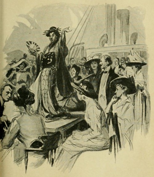La marquise Yorisaka portait une robe de Doucet, de Callot ou de Worth. Et cela s'imposait aux regards d'abord, parce que cette robe, gracieuse, bien faite, seyante même, mais conçue, imaginée, inventée par un Européen, pour des Européennes, prenait, autour d'une Japonaise frêle et fluette, une importance et un volume extraordinaires,—à la façon d'un très large cadre de bois doré autour d'une aquarelle grande comme la main.—Pour comble, la marquise Yorisaka était coiffée à l'inverse de la tradition: point de coques lustrées, ni de larges bandeaux enveloppant tout le visage; mais un chignon allongé, qui tirait en arrière toute la chevelure; en sorte que la tête, découronnée du classique turban couleur d'ébène, apparaissait minuscule et ronde, comme sont les têtes de poupées.
