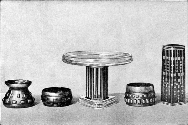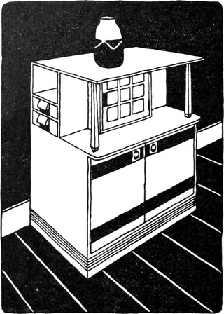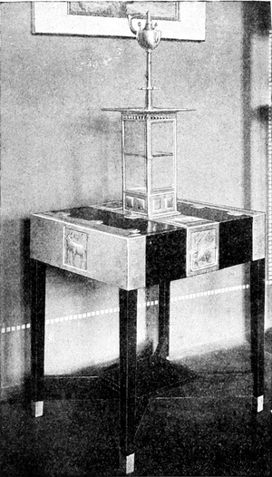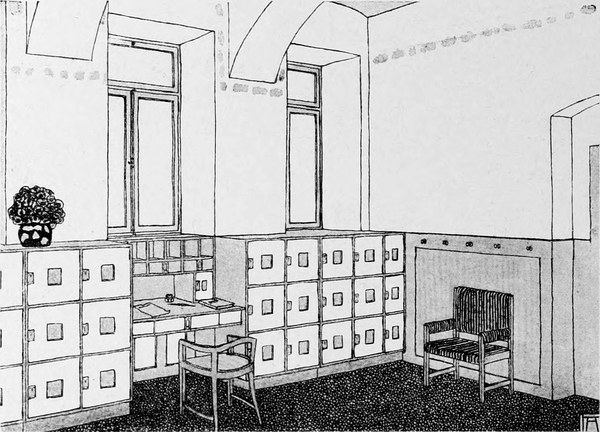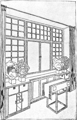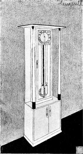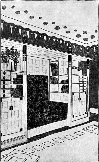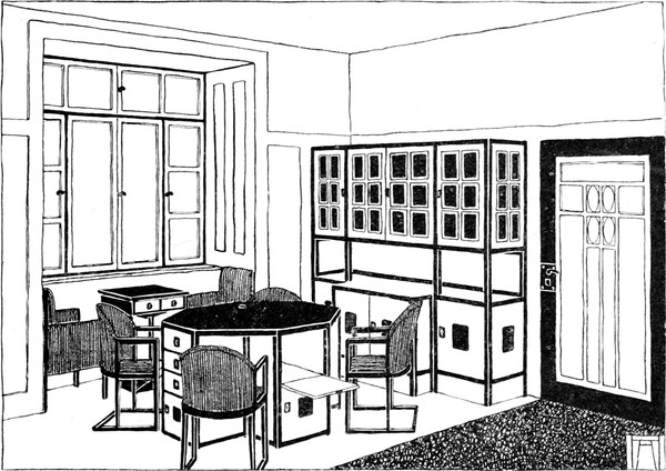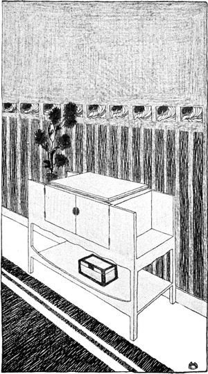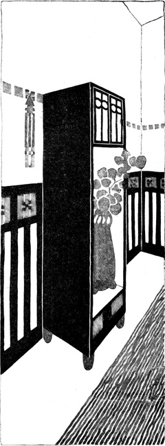 Das Studium alter Kulturen hat uns gelehrt, daß je erhabener die Kunst, desto größer die Einfachheit war. Wenn wir wollen, daß die Kunst ihren Ausgangspunkt in dem Hause nehme, dann müssen wir aus unseren Häusern alle überflüssigen und störenden Gegenstände fortnehmen, den sogenannten Luxus, den Komfort, der in Wirklichkeit gar kein Komfort ist, weil er nur unnötige Plage macht und für nichts gut und nützlich ist. Der wirklichen Gebrauchsgegenstände sind verhältnismäßig wenige. Wenden wir uns einmal an die kleinste Wohnung, die von einer alleinstehenden Person bewohnt wird, an das sogenannte Junggesellenheim, so finden wir in der Regel ein einziges Zimmer, in dem geschlafen und gearbeitet wird, wobei eine Arbeit vorausgesetzt ist, die nicht viel Unordnung verursacht. Wir finden darin einen Bücherschrank, der eine Menge Bücher enthält, ein Bett, das mit weißen weichen Leinenvorhängen, die mit Aufnäharbeit versehen, abnehmbar und waschbar sind, verschlossen ist, und bei Tag, wenn die Vorhänge, die in metallenen Ringen laufen, zurückgezogen sind, als Divan benützt werden kann. Das Nacht[S. 101]kästchen, wie ein einfaches Schränkchen gebaut, dient bei Tag als Bücherablage, als Ständer für Vasen und Rauchzeug. Dann ein Tisch, der sicher steht, um daran zu schreiben oder zu arbeiten. Mehrere Stühle, die sich leicht von einem Ort an den anderen bringen lassen, ein Kleiderschrank mit Schubkästen für Wäsche und derlei, und solche Bilder und Stiche, als es die Mittel erlauben, ja keine Lückenbüßer, sondern wirkliche Kunstwerke, was heute unschwer für wenig Geld zu haben ist; auch eine oder zwei Vasen gehören hieher, um Blumen hineinzutun, namentlich wenn man in einer Stadt lebt. Ein Ofen gehört natürlich ins Zimmer, aber man zieht einen kleinen Gaskamin vor, der, artig von einem Holzgehäuse umgeben, an seinem Bord allerlei, Gegenstände der Kleinkunst aufzunehmen geeignet ist.