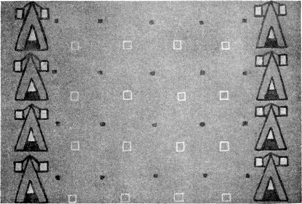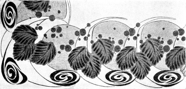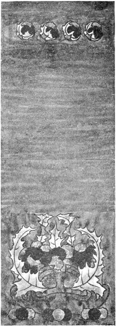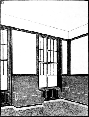 4. Man wird vielleicht Bilder in diesem Schlafzimmer anbringen wollen. Man hänge keine goldenen Rahmen auf den Grund der Tapete, sondern treffe eine solche Anordnung, daß die Malerei einen tektonischen Teil der Wand selbst bildet. In andern Worten, man[S. 130] wähle einen Fries oder ähnliche andere dekorative Malereien, die man seinem Urteile nach für gut findet. Das Werk muß einigermaßen mehr sein als interessant; es muß beitragen zur frischen und ursprünglichen Farbengebung, die man als passend für ein Schlafzimmer findet, und man führt sie daher so durch, daß die Malerei nicht aus der Mauer hervorspringt, sondern flächig wirkt, und im ganzen eine ebenso wirkungsvolle als bescheidene Rolle spielt.