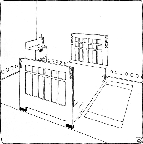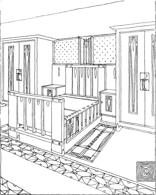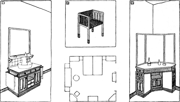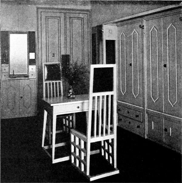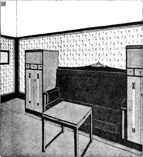 3. Die bisherigen Betrachtungen haben rasch über die Grundzüge des Entwurfes belehrt. Die Notwendigkeit, die man fühlt, das[S. 128] Zimmer weiter, geräumiger und luftiger erscheinen zu lassen als es wirklich ist, führt mit der Logik des gesunden Menschenverstandes zu verschiedenen praktischen Lösungen. Man entscheidet sich zum Beispiel, keine gemusterte Tapete zu nehmen. Wenn eine Wand über und über gemustert ist, so lockt sie von allen Standpunkten die Aufmerksamkeit auf sich, sie scheint sich dem Auge dadurch näher zu bringen und dem Raum einiges von seiner Länge und Breite zu rauben. Man entscheidet sich auch dafür, daß die Einrichtung nicht mehr Raum einnehmen darf, als unbedingt erforderlich ist; daher muß die handwerkliche Leistung die höchsten konstruktiven Vorzüge aufweisen, damit man den höchsten Grad von Annehmlichkeit und Zweckmäßigkeit mit dem geringsten Aufwand von Holz erreicht. Nachdem das Zimmer ein Schlafzimmer ist, hat man ganz recht, das Bett als das wichtigste Möbelstück zu betrachten, und es aus Holz herzustellen, teils weil gut gearbeitetes Holz so schön und ruhig harmonisch wirkt, teils weil Messingbetten nicht immer mit den Farben übereinstimmen, welche man im Auge hat, und endlich, weil sich Metall zu frostig anfühlt. Das[S. 129] Bett wird nicht so niedrig sein, daß sich die Magd versucht fühlen könnte, die Reinigung des Fußbodens darunter zu vernachlässigen, noch wird es so hoch sein, daß der Raum zwischen Matratze und Fußboden als Speicher für Schachteln und für Staubansammlung geeignet erscheint. Wenn man zum Schluß das Schlafzimmer als Krankenzimmer auffassen will, ist der Grundsatz der Wohnlichkeit unerläßlich, ebenso eine ruhige Heiterkeit in der Farbengebung.