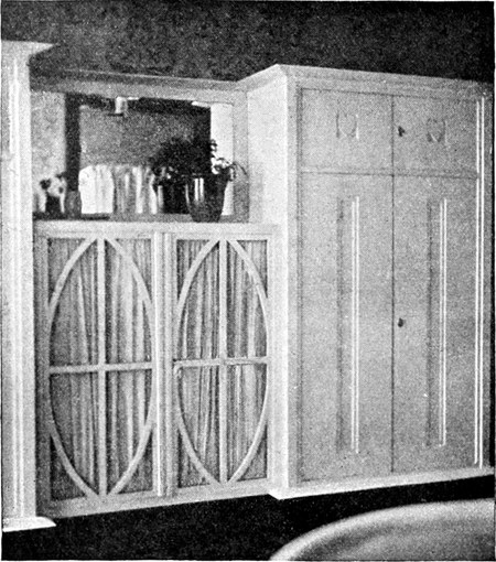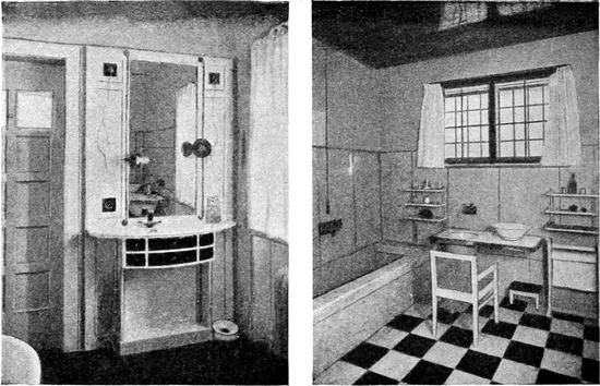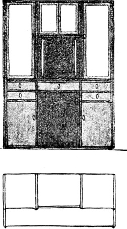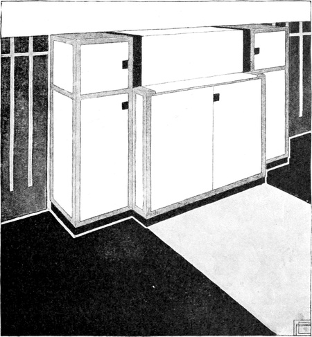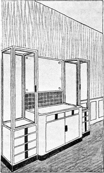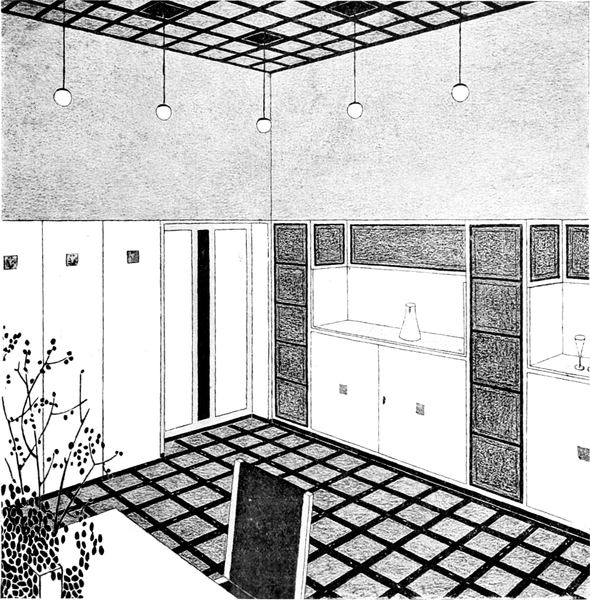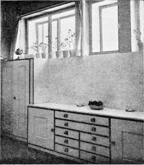 Gegenüber den alten Küchen, so vollkommen sie auch mit Gerätschaften versehen sein mochten, haben die heutigen, von modernen Architekten eingerichteten Küchen entschieden bedeutende Vorzüge aufzuweisen. Das Gebot der Zweckmäßigkeit und sanitäre Rücksichten[S. 52] erfordern, daß die Küchen hell seien, in modernen Landhäusern legt man daher die Fenster breit und ziemlich hoch an, selbst wenn dies nicht durch die tiefe Lage des Raumes im Souterrain erforderlich sein sollte, damit die Wandflächen für die Kücheneinrichtung gut ausgenützt werden können. Unter diesen Fenstern befinden sich in der Regel die Schränke mit möglichst viel Laden und Stellagen, die mit Glastüren verschlossen sind. In der Mitte der Wand, unterhalb der Fenster finden wir häufig den Anrichtetisch, in seinen Unterteilen als Schrank ausgenützt und von einem Gesims mit verschließbaren Fächern gekrönt. Auf der gegenüberliegenden Seite steht der Herd. Im Gegensatz zur Küche von einst, die man erst dann für schön erachtete, wenn das blitzblanke Messing- und Kupfergeschirr, die bunten Töpfe aus Steingut und Porzellan, die Zinn- und Blechgefäße an Wänden und offenen Stellagen zum Entzücken der Hausfrau prangend ausgestellt waren, liebt man es heute, jegliches Küchenrequisit in den Schränken abzuschließen und hat damit vollkommen recht. Denn so kann das Geschirr von Staub und Fliegenunrat frei gehalten werden und man erspart ein Übermaß von Reinigungsarbeit. Nur das Kupfergeschirr läßt man frei hängen. Eine solche Küche sieht aber auch appetitlich genug aus, namentlich, wenn die Wände weiß verkachelt sind, wie das neuestens oft der Fall ist. Bis zu einer gewissen Höhe wenigstens sollen die Wände verkachelt sein, soweit eben spritzendes Wasser reicht. An Stelle der Kacheln werden auch dünne Marmorplatten verwendet und zwar nur weiße, weil es aus begreiflichen Gründen Grundsatz ist, daß weiß vorherrsche. Darum werden sämtliche Holzgegenstände, also die ganze Kücheneinrichtung weiß lackiert, wobei man den Vorteil hat, durch einfaches Abwaschen jeden Schmutz leicht zu entfernen. Daß man auf weiß jede Unreinlichkeit[S. 53] sofort sieht, ist nur ein Vorzug, denn sie soll nirgends und am allerwenigsten in der Küche geduldet werden. Will man durchaus ein Ornament, so soll es nur ein Flachornament sein, aufschablonirt und sparsam angewendet. Jede Schnitzerei ist zu verpönen, sie wirkt nur als Staubfänger. Im Übrigen hat man Bedacht auf gradlinige einfache Formen ohne Gesimse, und auf einfache ungeteilte Holzflächen, die durch bloßes Abwischen rein gehalten werden können. Die Küchenmöbel sollen mit ihrer Fläche bis auf den Fußboden herabgehen und auf diesem ohne Füße fest aufstehen, damit sich unterhalb der Schränke keine unkontrollierbaren Schmutzwinkel bilden können. Dagegen tut man gut, die Stuhl- und Tischflächen, die oft gerieben werden müssen, überhaupt nicht zu streichen, sondern bloß fein gehobelt im ursprünglichen Holzton stehen zu lassen, und so einzurichten, daß sie abnehmbar sind. Auf diese Art können sie am besten gewaschen und gerieben werden, wovon das Holz bald ein blühweißes Aussehen bekommt. In Bezug auf den Fußboden hat man auch zu bedenken, daß in Küchen immer Wasser verschüttet wird, und daß er mit Wasser abgeschwemmt und solcherart leicht gereinigt werden soll. Darum wird man den Steinboden dem bisherigen Brettelboden vorziehen. Der Steinboden aber bedeutet einen Angriff auf die Gesundheit der Köchinnen, die ohnehin meistens gichtisch sind. Da bietet denn das Xylolith einen Ausweg. Xylolith ist ein Kunststein, der auf Holz aufgetragen wird, nicht so[S. 54] hart wie Naturstein ist, aber sonst alle seine Vorzüge aufweist und noch mehr. Er ist nämlich schon in allen Farben zu haben und man kann ihn nach seinem persönlichen Geschmack wählen. Zu dem blinkenden Weiß der Wände passt sehr gut ein roter oder blauer Xylolithboden.