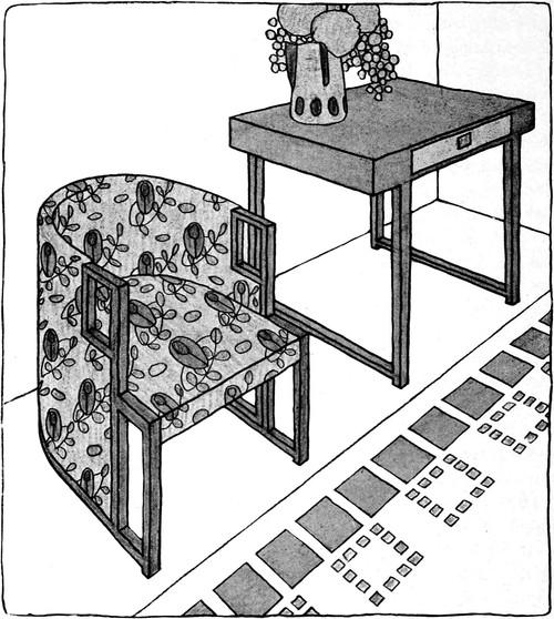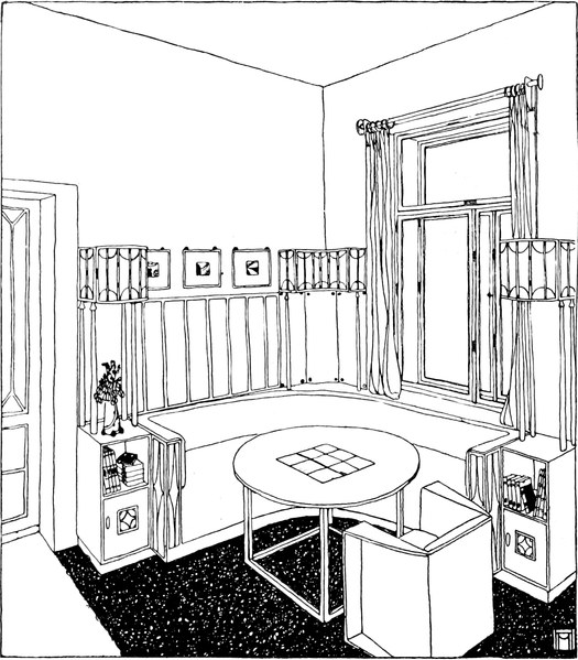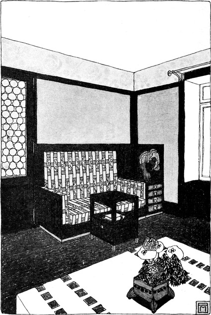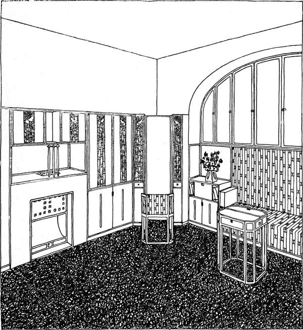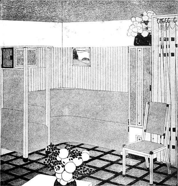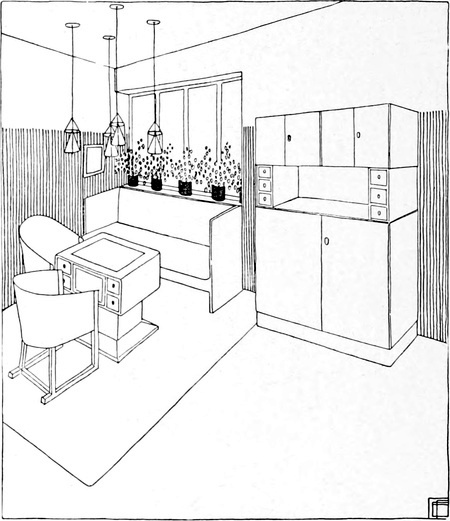 Wo diese Auffassung platzgreift, stellen sich die neuen Grundsätze für die zweckmäßige Einrichtung ungerufen ein. Die gute Hausfrau, die bereits gemerkt hat, um was es sich handelt, weiß nun mit einemmal, was sie für ihren Salon braucht. Sie wird Wände und Plafond in einfachen ruhigen Farben halten, vielleicht einfärbig bloß mit einem herumlaufenden Fries, oder sie wird, wenn sie Stofftapeten haben will, zu einem modernen Muster greifen. In Stofftapeten ist auch mehr Farbenfreude und Lebhaftigkeit der Zeichnung statthaft. Sie wird die Möbel so einfach, aber auch so gediegen herstellen lassen als möglich, vielleicht aus Mahagoni oder rotgebeiztem Holz, mit dem sich auch weiße Lackmöbel gut verbinden lassen. Die Möglichkeiten sind nicht auszudenken, der gute Geschmack wird mit allen Mitteln das richtige treffen. Die Anordnung der Möbel wird selbstverständlich von der bisherigen Aufstellung sehr verschieden sein müssen. Man wird in einem solchen intimen Raum Wert darauf legen, eine gemütliche Plauderecke zu besitzen, ein[S. 73] cozy-corner, das eine Ecke des Zimmers füllt, eine halbkreisförmige gepolsterte Sitzgelegenheit enthält, und ein Tischchen davor, wo man behaglich sitzen kann, den ganzen Raum beherrscht und sich dennoch abgeschlossen und geborgen fühlt. Das Fenster, das bei der Art unserer Zimmer leider so wenig Raum an der Wandseite läßt, wird einfach zur unteren Hälfte verkleidet, wenn es sich nicht anders tun läßt. Von[S. 74] diesem Platze aus ergibt sich die geschmackvolle Aufstellung der anderen Möbelstücke, die immer nur nach Maßgabe des persönlichen Bedürfnisses vorhanden sein werden, ganz leicht.