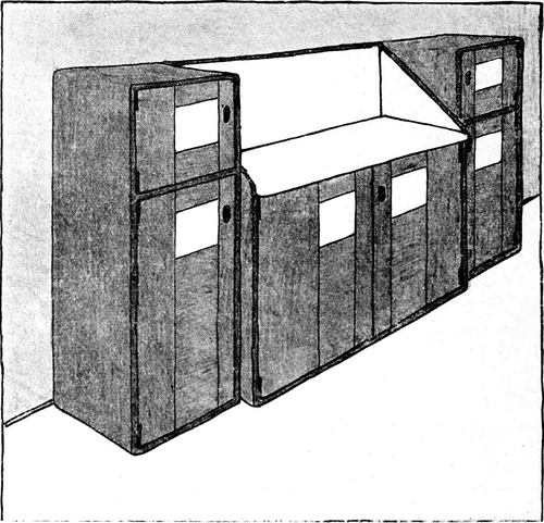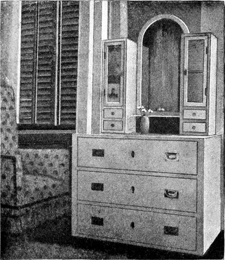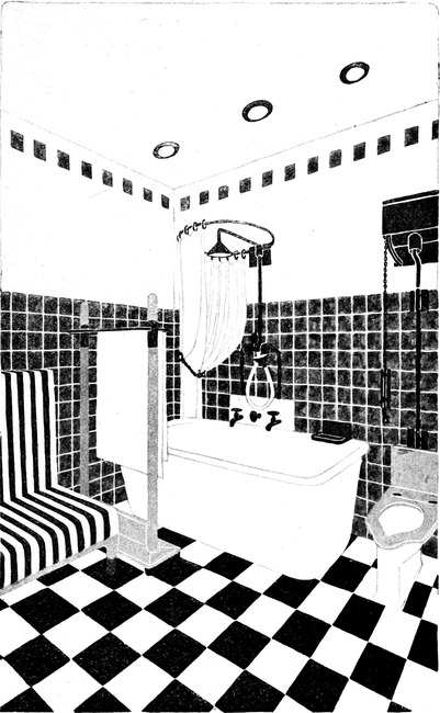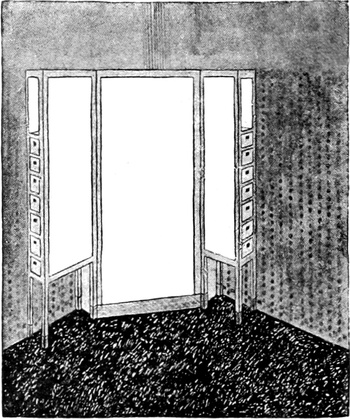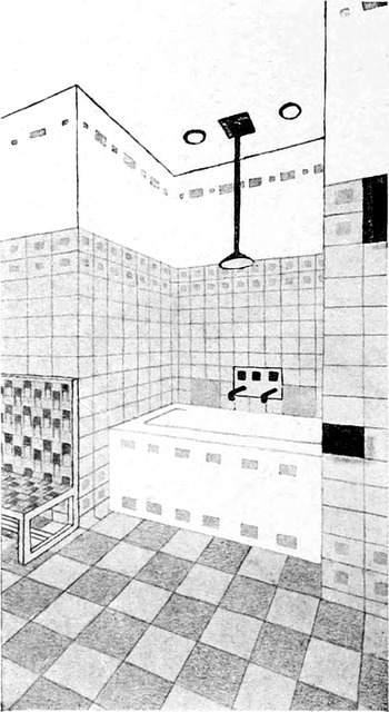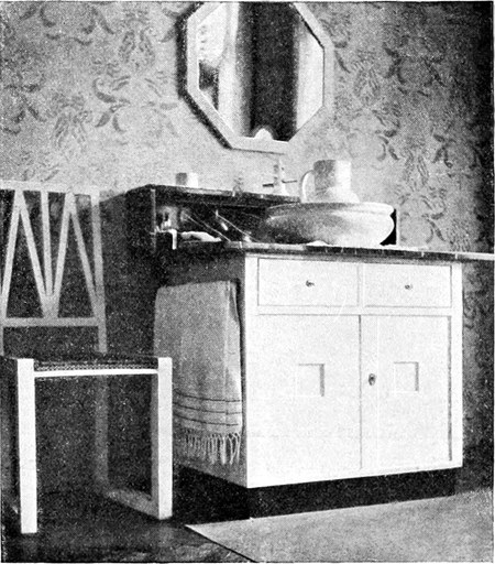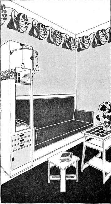 1. Man kann annehmen, daß der Raum, der einem zur Verfügung steht, klein ist, wie in den meisten Schlafzimmern. Man wird daher mit den Dimensionen das Möglichste tun, um den Eindruck von Geräumigkeit[S. 127] und Luftigkeit hervorzubringen. Der Raum soll nicht nur angenehm sein für den Schlafenden, sondern auch für das Erwachen.