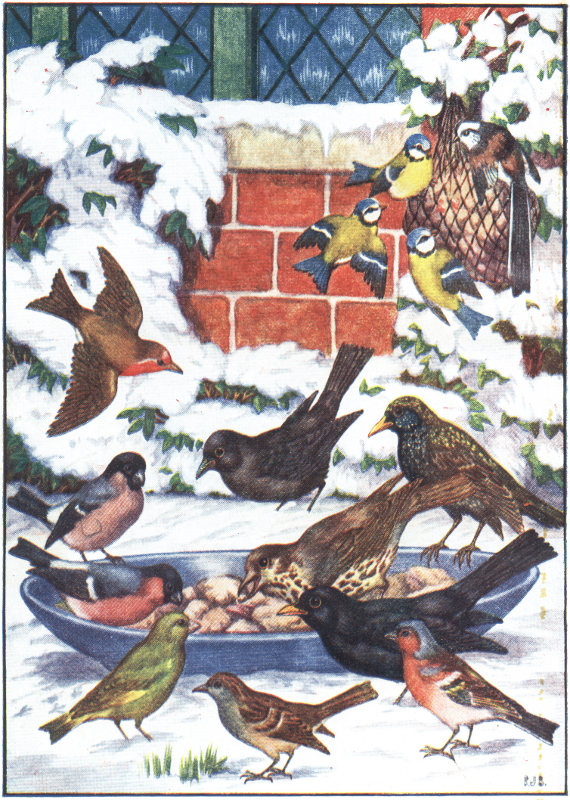 He looked out and saw a crowd of birds hopping on the frozen lawn round the well-filled dish. The little net, which hung just outside the window, was alive with hungry tomtits. They pecked eagerly at the suet, and chattered their thanks between every mouthful.