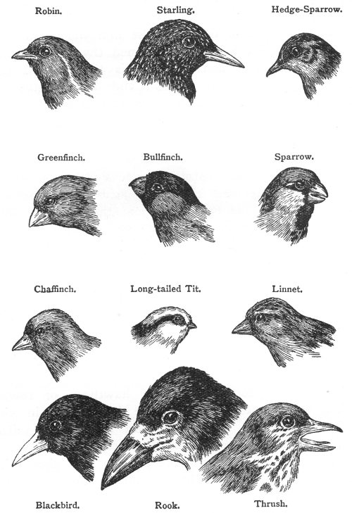 “We know those you pointed out to us yesterday,” said Frank. “There is the chaffinch, the thrush, the greenfinch, the blackbird, and the hedge-sparrow, but I don’t know that one with the bright red breast, black velvet head, and grey wings. And there is a new one among the tomtits. He has a very long tail, and is like a small parrot.”