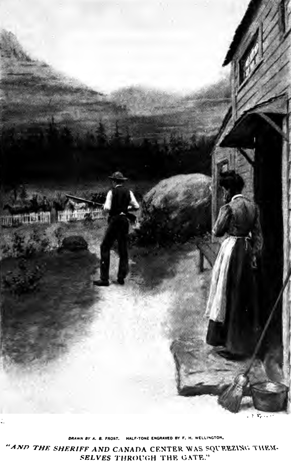 About four o'clock in the afternoon it come off misty, and I started over to tell Jim he'd better get out; and sudden I stops and looks, for there was a crowd coming from Canada Center—the Storrses and the Petersons and the Merimys, and the extra woman in a buggy with Henry Hall, who was county sheriff then. “Well, 'Mighty!” says I.