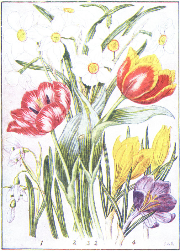 “If you remember,” said Uncle George, “in our lesson on seeds we learned that a seed contained a baby plant and a large supply of plant-food. I am now going to show you that both the corm and the bulb contain a large food supply. We have seen that the protective bud-scales in the corm are tough and thin, while the stem is swollen and hard. In the bulb, on the other hand, the bud-scales are thick and fleshy, while the stem is flat and very small. If we place some of our crocus corms 15 or snowdrop bulbs in pure water, they will grow and flower just as well as if we had planted them in the garden. What does this show us?”