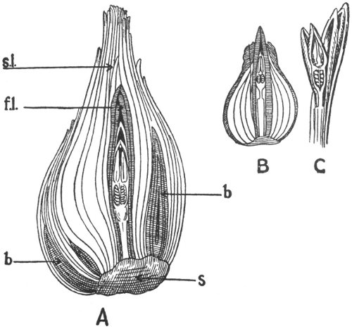 “Oh no, Tom, there are other leaves besides green leaves, called scale-leaves. Green leaves, as you know, give off the moisture which the roots take up from the soil. They also take in plant-food from the air. Scale-leaves protect buds, flowers, and tender stems from cold and from insects. These thin brown leaves of the crocus corm are scale-leaves formed underground. Please remove the brown scale-leaves from one of the corms, Frank.”