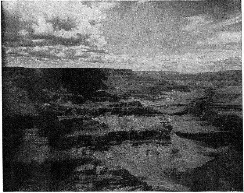 The Grand Canyon of Arizona and the Marble Canyon constitute one great gorge carved by a mighty river through a high plateau. On the northeast and north a line of cliffs face this plateau by a bold escarpment of rock. Climb these cliffs and you must ascend from 800 to 1,000 feet, but on their summit you will stand upon a plateau stretching away to the north. Now turn to face the south and you will overlook the cliff and what appears to be a valley below. From the foot of the cliff the country rises to the south to a great plateau through which the Marble and the Grand canyons are carved. This plateau terminates 14 abruptly on the west by the Grand Wash Cliffs, which is a high escarpment caused by a “fault” (as the geologist calls it), that is, the strata of sandstone and limestone are broken off, and to the west of the fracture they are dropped down several thousand feet, so that standing upon the edge of the plateau above the Grand Wash Cliffs you may look off to the west over a vast region of desert from which low volcanic mountains rise that seem like purple mounds in sand-clad lands.