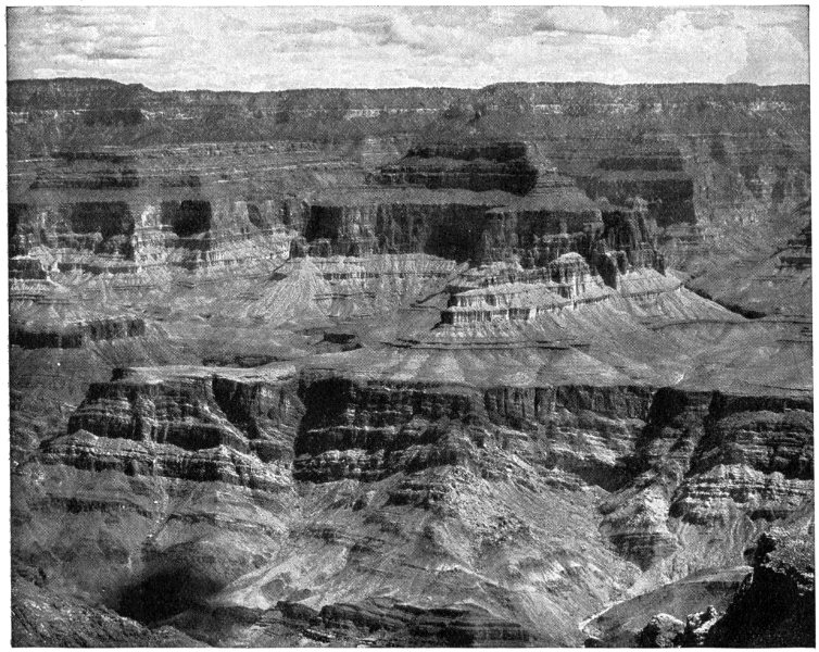 The Grand Canyon country is not only the hugest, but the most varied and instructive example on earth of one of the chief factors of earth-building—erosion. It is the mesa country—the Land of Tables. Nowhere else on the footstool is there such an example of deep-gnawing water or of water high-carving. The sandstone mesas of the Southwest, the terracing of canyon walls, the castellation, battlementing, and cliff-making, the cutting down of a whole landscape except its precipitous islands of flat-topped rock, the thin lava table-cloths on tables 100 feet high—these are a few of the things which make the Southwest wonderful alike to the scientist and the mere sight-seer.