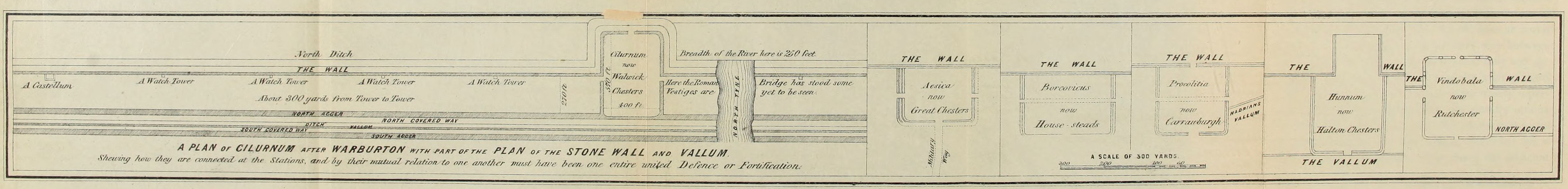 101. Horsley remarks, 'I cannot say that Hadrian’s Vallum has made the south rampart of this station at Housesteads, but I think it has passed it not much to the south, and seems to have a small turn just at the brook, in order to come near, if not up to it.' This looks as if Horsley could not altogether throw off the idea that the works exhibit unity of design. Hutton notices his inconsistency, and, quoting him, (as transferred to the pages of ‘the judicious Warburton,’) writes—‘But can a thing be brought near to what does not exist! Hadrian was dead long before the appearance of this station.’