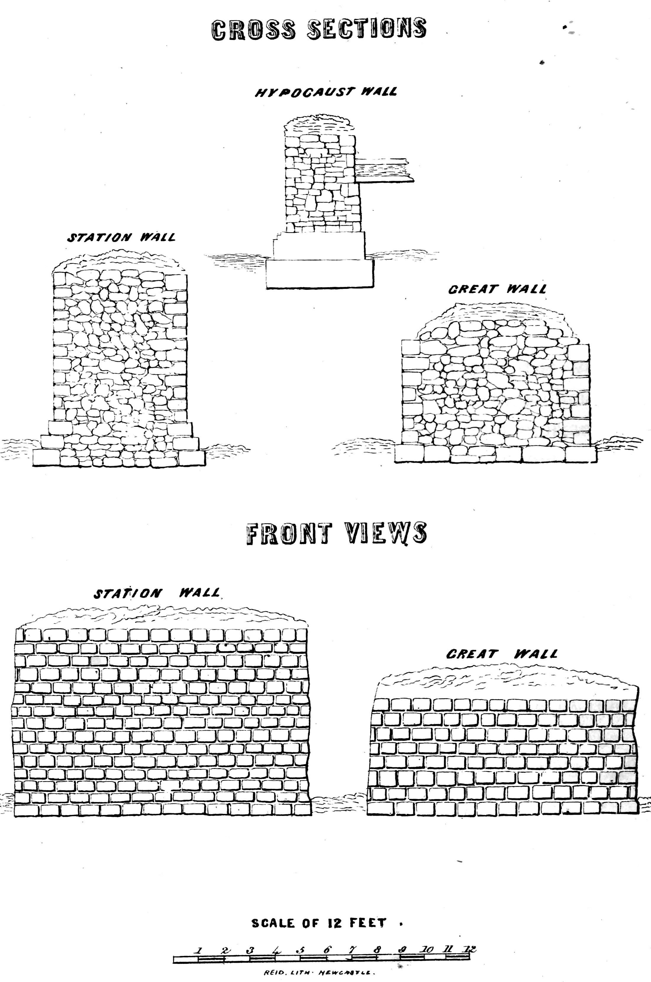 78. Unable to resist the positive testimony of an intelligent eye-witness, I was, at first, disposed to think that he had included in his measurement some chamber on the inside of the station wall. I am now prepared to receive the statement without deduction. Some recent excavations at Risingham have laid bare a part of the curtain wall which has been built double, the intervening space, or chamber, being filled up with rubble and rubbish run together with lime, so as to form a solid mass of masonry of considerable thickness. The object of this arrangement may have been, to form a solid, elevated platform, for the use of the soldiery.