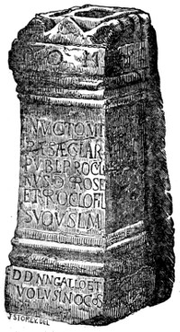127. Some antiquaries have conceived, that in the last two words of the inscription, a reference is made to the emperor Septimius Severus. This cannot be admitted, for—1. The emperor’s name would not be placed after that of the prefect: 2. The term instante implies the discharge of a subordinate duty; for, not to mention other examples, the temple of which the Cilurnum slab records the restoration (p. 186), was built by command of Marius Valerianus, under the superintendence of (instante) Septimius Nilus: 3. That princeps was the designation of a subordinate officer in the army, appears not only from a collation of other inscriptions, but from the following statement of Manutius—'In a legion there were three kinds of foot soldiers, hastati, principes, and triarii, and in each there were ten centurions, who were called the first hastatus, the second hastatus, the third, and so on, up to the tenth; the first princeps, the second, and so on; but the triarii, the bravest of all, were named in a different manner, for they did not call them first triarius, but primipilus, or primipili centurio.'—Arch. Æl., ii. 88.
