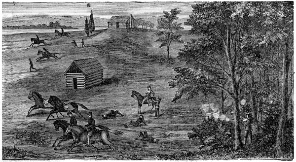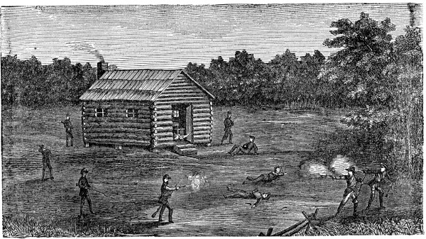 I was hauled to the house of William M. Highley, who went after a physician to have my wound dressed. The wound proved to be a very serious one, and disabled me for a long time in such a manner that I was unable to walk. I was next hauled to Samuel Gossom‘s, and then to the residence of my uncle, John Williams. As this became the scene of a furious battle a few days afterwards, I shall be a little minute in my description. My uncle‘s family consisted of himself, Aunt Mary and a granddaughter 292 about six years of age. His house is among the hills in the western part of St. Francois county, five miles from Big River Mills, and one mile due south from the stone house formerly occupied by Dick Berryman. My uncle‘s premises consisted of one log house, one story high, and containing but one room. In the yard west of the house stood an old dilapidated cabin with the chimney torn down, near which stood the smoke-house and a cluster of young cherry trees. Opposite the south end of the house, at a distance of about eighty yards, was the spring house.