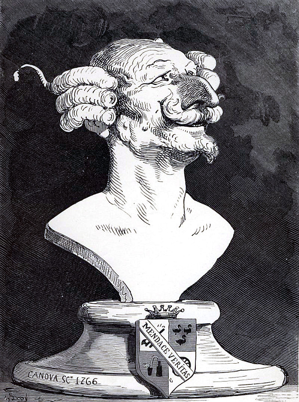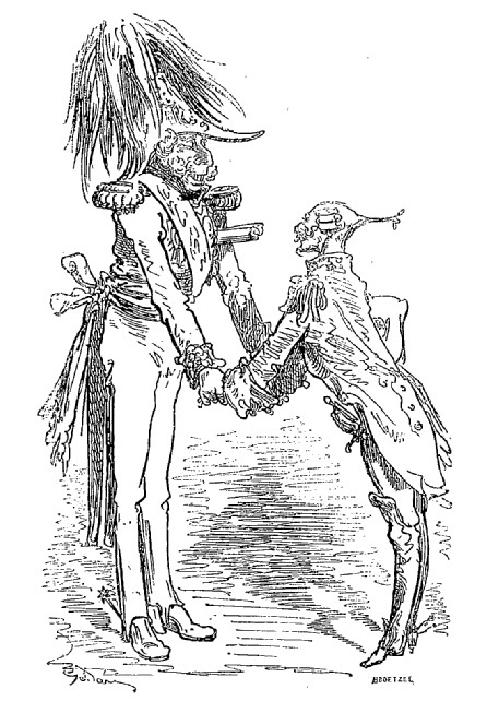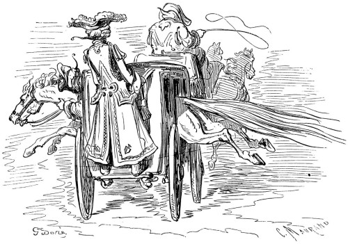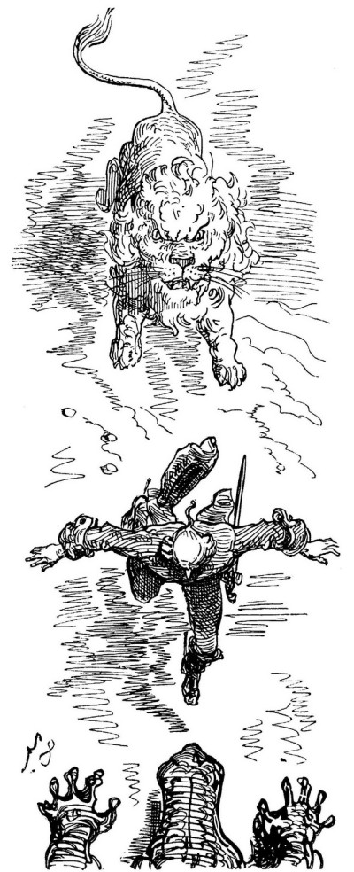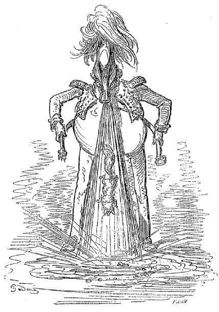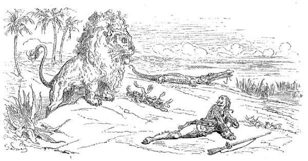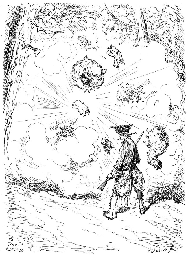 Les Aventures du baron de Münchhausen jouissent en Allemagne d'une célébrité populaire qu'elles ne sauraient manquer, nous l'espérons du moins, d'acquérir bientôt en France, malgré leur forte saveur germanique, et peut-être à cause même de cela: le génie des peuples se révèle surtout dans la plaisanterie. Comme les œuvres sérieuses chez toutes les nations ont pour but la recherche du beau qui est un de sa nature, elles se ressemblent nécessairement davantage, et portent moins nettement imprimé le cachet de l'individualité ethnographique. Le comique, au contraire, consistant dans une déviation plus ou moins accentuée du modèle idéal, offre une multiplicité singulière de ressources: car il y a mille façons de ne pas se conformer à l'archétype. La gaieté française n'a aucun rapport avec l'humour britannique; le witz allemand diffère de la bouffonnerie italienne, et le caractère de chaque nationalité s'y montre dans son libre épanchement. Le baron de Münchhausen, en dépit de ses hâbleries incroyables, n'a nul lien de parenté avec le baron de Crac, autre illustre menteur. La blague française, qu'on nous pardonne d'employer ce mot, lance sa fusée, pétille et mousse comme du vin de Champagne, mais bientôt elle s'éteint, laissant à peine au tond de la coupe deux ou trois perles de liqueur. Cela serait trop léger pour des gosiers allemands habitués aux fortes bières et aux après vins du Rhin: il leur faut quelque chose de plus substantiel, de plus épais, de plus capiteux. La plaisanterie, pour faire impression sur ces cerveaux pleins d'abstractions, de rêves et de fumée, a besoin de se faire un peu lourde; il faut qu'elle insiste, qu'elle revienne à la charge, et ne se contente pas de demi-mots qui ne seraient pas compris. Le point de départ de la plaisanterie allemande est cherché, peu naturel, d'une bizarrerie compliquée, et demande beaucoup d'explications préalables assez laborieuses; mais la chose une fois posée, vous entrez dans un monde étrange, grimaçant, fantasque, d'une originalité chimérique dont vous n'aviez aucune idée. C'est la logique de l'absurde poursuivie avec une outrance qui ne recule devant rien. Des détails d'une vérité étonnante, des raisons de l'ingéniosité la plus subtile, de attestations scientifiques d'un sérieux parfait servent à rendre probable l'impossible. Sans doute, on n'arrive pas à croire les récits du baron de Münchhausen, mais à peine a-t-on entendu deux ou trois de ses aventures de terre ou de mer, qu'on se laisse aller à la candeur honnête et minutieuse de ce style, qui ne serait pas autre, s'il avait à raconter une histoire vraie. Les inventions les plus monstrueusement extravagantes prennent un certain air de vraisemblance, déduites avec cette tranquillité naïve et cet aplomb parfait. La connexion intime de ces mensonges qui s'enchaînent si naturellement les uns aux autres finit par détruire chez le lecteur le sentiment de la réalité, et l'harmonie du faux y est poussée si loin qu'elle produit une illusion relative semblable à celle que font éprouver les voyages de Gulliver à Lilliput et à Brobdignag, ou bien encore l'Histoire véritable de Lucien, type antique de ces récits fabuleux tant de fois imités depuis. Ici, le crayon de Gustave Doré augmente encore le prestige; personne mieux que cet artiste, qui semble avoir cet œil visionnaire dont parle Victor Hugo dans sa pièce à Albert Durer, ne sait faire vivre d'une vie mystérieuse et profonde les chimères, les rêves, les cauchemars, les formes insaisissables noyées de lumière et d'ombre, les silhouettes drôlatiquement caricaturales, et tous les monstres de la fantaisie; il a commenté les aventures du baron de Münchhausen de dessins qui semblent les planches d'un voyage de circumnavigation par leur fidélité caractéristique et leur exotique bizarrerie. On dirait que, peintre de l'expédition, il a croqué d'après nature tout ce que décrit le facétieux baron allemand, et le texte en acquiert une valeur de bouffonnerie froide plus germanique encore.