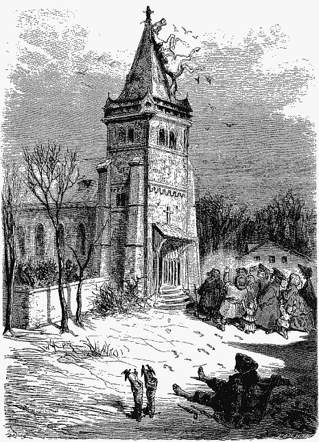 Harassé, n'en pouvant plus, je me décidai à descendre de cheval; j'attachai ma bête à une sorte de pointe d'arbre qui surgissait de la neige. Je plaçai, par prudence, un de mes pistolets sous mon bras, et je m'étendis sur la neige. Je fis un si bon somme, que, lorsque je rouvris les yeux, il faisait grand jour. Quel fut mon étonnement lorsque je m'aperçus que je me trouvais au milieu d'un village, dans le cimetière! Au premier moment, je ne vis point mon cheval, quand, après quelques instants, j'entendis hennir au-dessus de moi. Je levai la tête, et je pus me convaincre que ma bête était suspendue au coq du clocher. Je me rendis immédiatement compte de ce singulier événement: j'avais trouvé le village entièrement recouvert par la neige; pendant la nuit, le temps s'était subitement adouci, et, tandis que je dormais, la neige, en fondant, m'avait descendu tout doucement jusque sur le sol; ce que, dans l'obscurité, j'avais pris pour une pointe d'arbre, n'était autre chose que le coq du clocher. Sans m'embarrasser davantage, je pris un de mes pistolets, je visai la bride, je rentrai heureusement par ce moyen en possession de mon cheval, et poursuivis mon voyage.