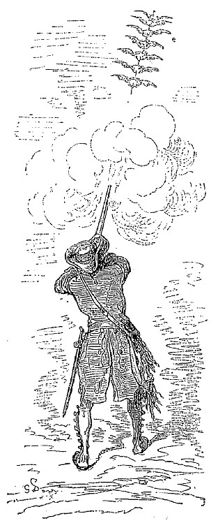 J'aurais pu allumer mon amorce en tirant du feu de mes yeux, comme je l'avais fait dans une circonstance précédente; mais cet expédient ne me tentait que médiocrement: il m'avait occasionné un mal d'yeux dont je n'étais pas encore complètement guéri. Je regardais désespérément mon couteau piqué droit dans la neige; mais tout mon désespoir n'avançait pas les choses d'un cran. Enfin il me vint une idée aussi heureuse que singulière. Vous savez tous par expérience que le vrai chasseur porte toujours, comme le philosophe, tout son bien avec lui: quant à moi, ma gibecière est un véritable arsenal qui me fournit des ressources contre toutes les éventualités. J'y fouillai et en tirai d'abord une pelote de ficelle, puis un morceau de fer recourbé, puis une boîte pleine de poix: la poix étant durcie par le froid, je la plaçai contre ma poitrine pour la ramollir. J'attachai ensuite à la corde le morceau de fer que j'enduisis abondamment de poix, et le laissai rapidement tomber à terre. Le morceau de fer enduit de poix se fixa au manche du couteau d'autant plus solidement que la poix, se refroidissant à l'air, formait comme un ciment; je parvins de la sorte, en manœuvrant avec précaution, à remonter le couteau. A peine avais-je revissé ma pierre, que maître Martin se mit en devoir d'escalader l'arbre.