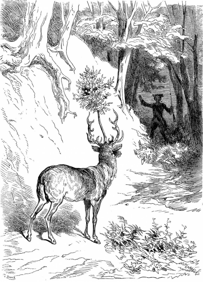 Un ou deux ans après, je repassais dans la même forêt, et voilà, ô surprise! que j'aperçois un magnifique cerf portant entre les cors un superbe cerisier, haut de dix pieds, pour le moins. Je me souvins alors de ma première aventure, et, considérant l'animal comme une propriété depuis longtemps mienne, d'une balle je l'étendis à terre, de sorte que je gagnai à la fois le rôti et le dessert; car l'arbre était chargé de fruits, les meilleurs et les plus délicats que j'eusse mangés de ma vie. Qui peut dire, après cela, que quelque pieux et passionné chasseur, abbé ou évêque, n'ait pas semé de la même façon la croix entre les cors du cerf de saint Hubert? Dans les cas extrêmes, un bon chasseur a recours à n'importe quel expédient, plutôt que de laisser échapper une belle occasion, et je me suis trouvé moi-même maintes fois obligé de me tirer par ma seule habileté des passes les plus périlleuses.