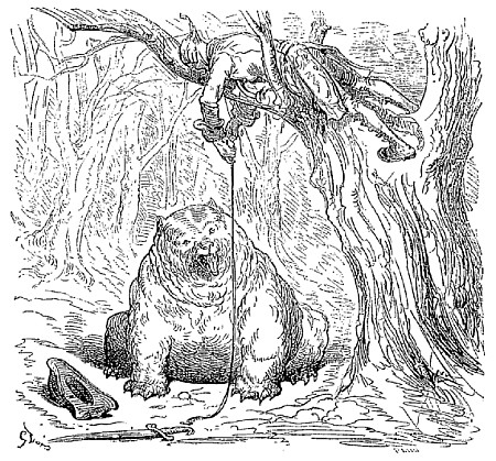 Je lui pris les pattes de devant dans mes deux mains et les serrai avec tant de cordialité qu'il se mit à hurler désespérément; mais moi, sans me laisser toucher par ses lamentations, je le tins dans cette position jusqu'à ce qu'il mourût de faim. Grâce à cet exploit, j'inspirai un tel respect à tous les ours, que depuis lors aucun d'eux n'a jamais osé me chercher querelle.