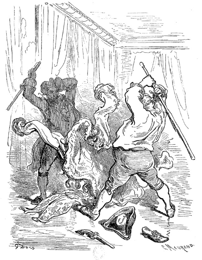 Je m'élance aussitôt, et je vois tous mes vêtements déchirés et mis en pièces. Le drôle avait dit vrai, mon manteau était enragé: j'arrivai juste au moment où le furibond se ruait sur un bel habit de gala tout neuf, et le secouait, et le dépeçait de la façon la plus impitoyable.